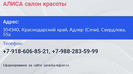 АЛИСА, салон красоты по адресу 354340, Краснодарский край, Адлер (Сочи), Свердлова, 55а в дальнейшем Организация, размещена в следующих категориях: