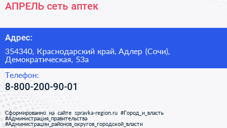 АПРЕЛЬ, сеть аптек по адресу 354340, Краснодарский край, Адлер (Сочи), Демократическая, 53а в дальнейшем Организация, размещена в следующих категориях: