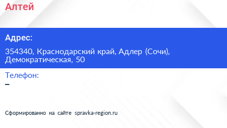 Алтей по адресу 354340, Краснодарский край, Адлер (Сочи), Демократическая, 50 в дальнейшем Организация, размещена в следующих категориях: