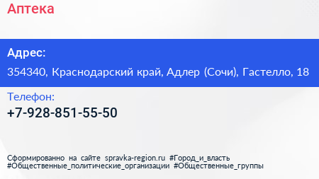 Аптека по адресу 354340, Краснодарский край, Адлер (Сочи), Гастелло, 18 в дальнейшем Организация, размещена в следующих категориях: