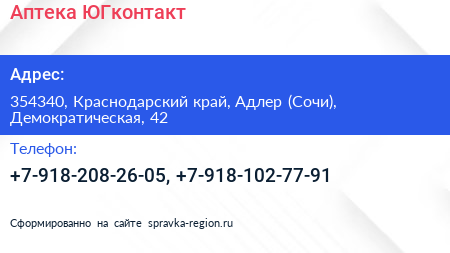 Аптека ЮГконтакт по адресу 354340, Краснодарский край, Адлер (Сочи), Демократическая, 42 в дальнейшем Организация, размещена в следующих категориях: