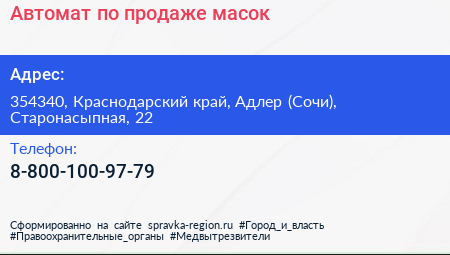 Автомат по продаже масок по адресу 354340, Краснодарский край, Адлер (Сочи), Старонасыпная, 22 в дальнейшем Организация, размещена в следующих категориях: