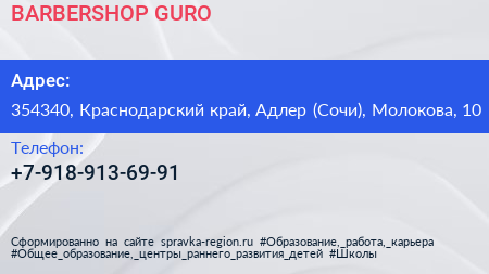 BARBERSHOP GURO по адресу 354340, Краснодарский край, Адлер (Сочи), Молокова, 10 в дальнейшем Организация, размещена в следующих категориях: