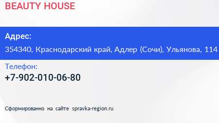 BEAUTY HOUSE по адресу 354340, Краснодарский край, Адлер (Сочи), Ульянова, 114 в дальнейшем Организация, размещена в следующих категориях: