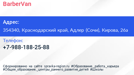 BarberVan по адресу 354340, Краснодарский край, Адлер (Сочи), Кирова, 26а в дальнейшем Организация, размещена в следующих категориях: