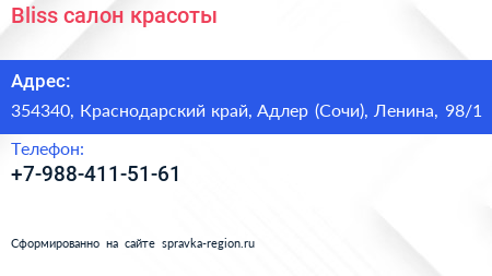 Bliss, салон красоты по адресу 354340, Краснодарский край, Адлер (Сочи), Ленина, 98/1 в дальнейшем Организация, размещена в следующих категориях: