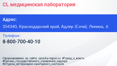 CL, медицинская лаборатория по адресу 354340, Краснодарский край, Адлер (Сочи), Ленина, 6 в дальнейшем Организация, размещена в следующих категориях: