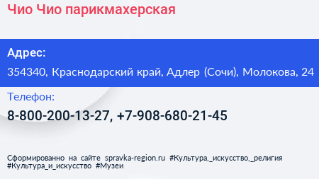 Чио Чио, парикмахерская по адресу 354340, Краснодарский край, Адлер (Сочи), Молокова, 24 в дальнейшем Организация, размещена в следующих категориях: