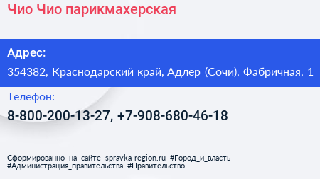 Чио Чио, парикмахерская по адресу 354382, Краснодарский край, Адлер (Сочи), Фабричная, 1 в дальнейшем Организация, размещена в следующих категориях: