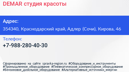 DEMAR, студия красоты по адресу 354340, Краснодарский край, Адлер (Сочи), Кирова, 46 в дальнейшем Организация, размещена в следующих категориях: