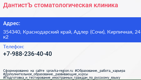 ДантистЪ, стоматологическая клиника по адресу 354340, Краснодарский край, Адлер (Сочи), Кирпичная, 24 к2 в дальнейшем Организация, размещена в следующих категориях: