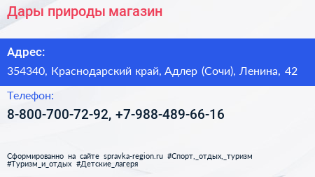 Дары природы, магазин по адресу 354340, Краснодарский край, Адлер (Сочи), Ленина, 42 в дальнейшем Организация, размещена в следующих категориях: