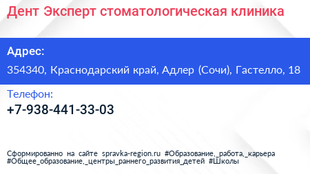 Дент-Эксперт, стоматологическая клиника по адресу 354340, Краснодарский край, Адлер (Сочи), Гастелло, 18 в дальнейшем Организация, размещена в следующих категориях: