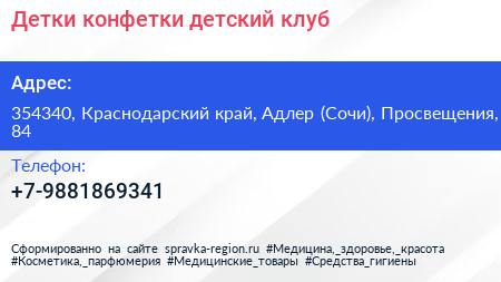 Детки конфетки, детский клуб по адресу 354340, Краснодарский край, Адлер (Сочи), Просвещения, 84 в дальнейшем Организация, размещена в следующих категориях: