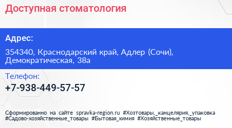 Доступная стоматология по адресу 354340, Краснодарский край, Адлер (Сочи), Демократическая, 38а в дальнейшем Организация, размещена в следующих категориях:
