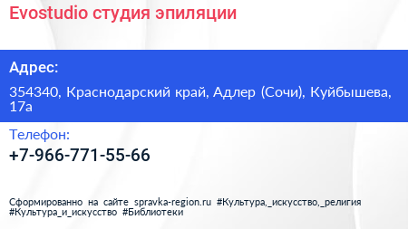 Evostudio, студия эпиляции по адресу 354340, Краснодарский край, Адлер (Сочи), Куйбышева, 17а в дальнейшем Организация, размещена в следующих категориях: