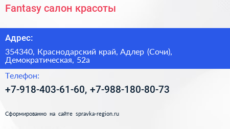 Fantasy, салон красоты по адресу 354340, Краснодарский край, Адлер (Сочи), Демократическая, 52а в дальнейшем Организация, размещена в следующих категориях: