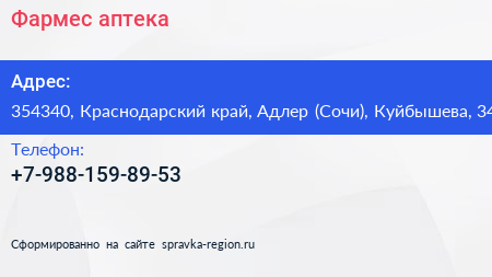 Фармес, аптека по адресу 354340, Краснодарский край, Адлер (Сочи), Куйбышева, 34 в дальнейшем Организация, размещена в следующих категориях: