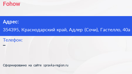 Fohow по адресу 354395, Краснодарский край, Адлер (Сочи), Гастелло, 40а в дальнейшем Организация, размещена в следующих категориях:
