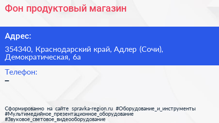 Фон, продуктовый магазин по адресу 354340, Краснодарский край, Адлер (Сочи), Демократическая, 6а в дальнейшем Организация, размещена в следующих категориях: