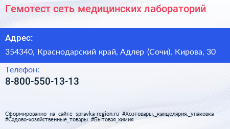 Гемотест, сеть медицинских лабораторий по адресу 354340, Краснодарский край, Адлер (Сочи), Кирова, 30 в дальнейшем Организация, размещена в следующих категориях: