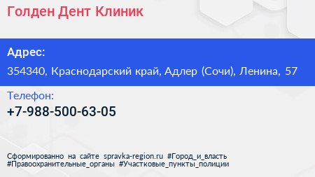 Голден Дент Клиник по адресу 354340, Краснодарский край, Адлер (Сочи), Ленина, 57 в дальнейшем Организация, размещена в следующих категориях: