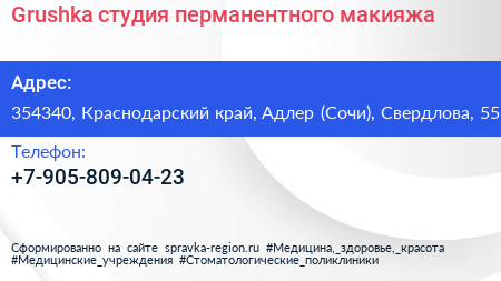 Grushka, студия перманентного макияжа по адресу 354340, Краснодарский край, Адлер (Сочи), Свердлова, 55 в дальнейшем Организация, размещена в следующих категориях: