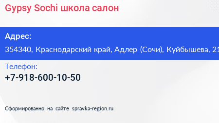 Gypsy Sochi, школа-салон по адресу 354340, Краснодарский край, Адлер (Сочи), Куйбышева, 21 в дальнейшем Организация, размещена в следующих категориях: