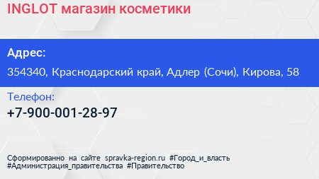 INGLOT, магазин косметики по адресу 354340, Краснодарский край, Адлер (Сочи), Кирова, 58 в дальнейшем Организация, размещена в следующих категориях: