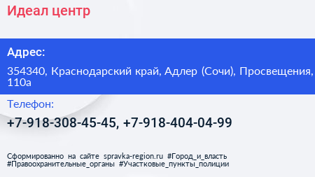 Идеал, центр по адресу 354340, Краснодарский край, Адлер (Сочи), Просвещения, 110а в дальнейшем Организация, размещена в следующих категориях: