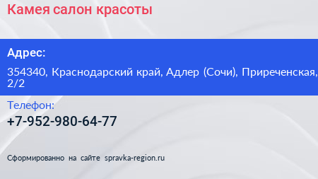Камея, салон красоты по адресу 354340, Краснодарский край, Адлер (Сочи), Приреченская, 2/2 в дальнейшем Организация, размещена в следующих категориях: