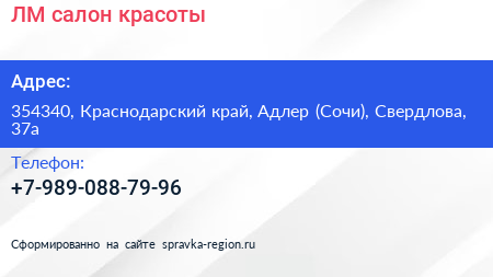 ЛМ, салон красоты по адресу 354340, Краснодарский край, Адлер (Сочи), Свердлова, 37а в дальнейшем Организация, размещена в следующих категориях: