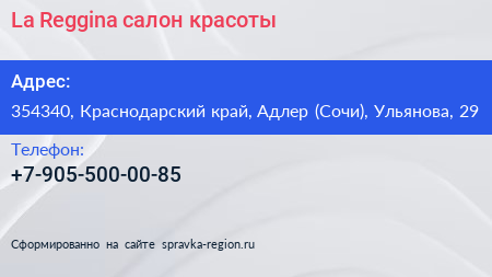 La Reggina, салон красоты по адресу 354340, Краснодарский край, Адлер (Сочи), Ульянова, 29 в дальнейшем Организация, размещена в следующих категориях: