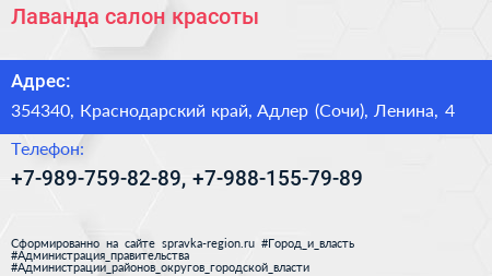 Лаванда, салон красоты по адресу 354340, Краснодарский край, Адлер (Сочи), Ленина, 4 в дальнейшем Организация, размещена в следующих категориях: