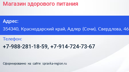 Магазин здорового питания по адресу 354340, Краснодарский край, Адлер (Сочи), Свердлова, 46 в дальнейшем Организация, размещена в следующих категориях: