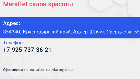 Maraffet, салон красоты по адресу 354340, Краснодарский край, Адлер (Сочи), Свердлова, 55 в дальнейшем Организация, размещена в следующих категориях: