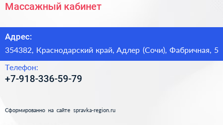 Массажный кабинет по адресу 354382, Краснодарский край, Адлер (Сочи), Фабричная, 5 в дальнейшем Организация, размещена в следующих категориях: