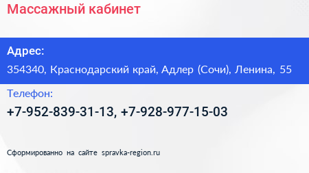 Массажный кабинет по адресу 354340, Краснодарский край, Адлер (Сочи), Ленина, 55 в дальнейшем Организация, размещена в следующих категориях: