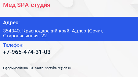 Мёд, SPA-студия по адресу 354340, Краснодарский край, Адлер (Сочи), Старонасыпная, 22 в дальнейшем Организация, размещена в следующих категориях: