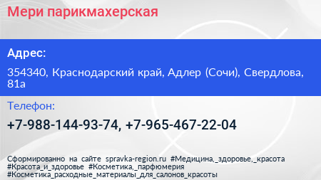 Мери, парикмахерская по адресу 354340, Краснодарский край, Адлер (Сочи), Свердлова, 81а в дальнейшем Организация, размещена в следующих категориях: