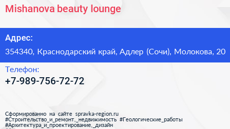 Mishanova beauty lounge по адресу 354340, Краснодарский край, Адлер (Сочи), Молокова, 20 в дальнейшем Организация, размещена в следующих категориях: