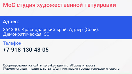 MoC, студия художественной татуировки по адресу 354340, Краснодарский край, Адлер (Сочи), Демократическая, 50 в дальнейшем Организация, размещена в следующих категориях: