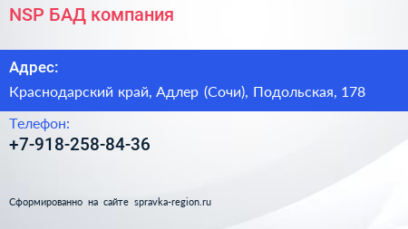 NSP БАД, компания по адресу Краснодарский край, Адлер (Сочи), Подольская, 178 в дальнейшем Организация, размещена в следующих категориях: