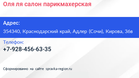 Оля-ля, салон-парикмахерская по адресу 354340, Краснодарский край, Адлер (Сочи), Кирова, 36в в дальнейшем Организация, размещена в следующих категориях: