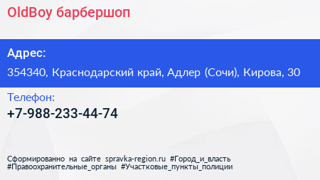 OldBoy, барбершоп по адресу 354340, Краснодарский край, Адлер (Сочи), Кирова, 30 в дальнейшем Организация, размещена в следующих категориях: