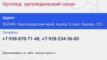 Ортопед+, ортопедический салон по адресу 354340, Краснодарский край, Адлер (Сочи), Кирова, 115 в дальнейшем Организация, размещена в следующих категориях: