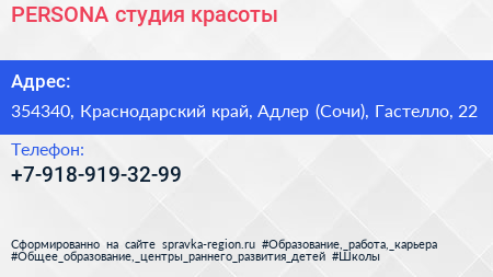 PERSONA, студия красоты по адресу 354340, Краснодарский край, Адлер (Сочи), Гастелло, 22 в дальнейшем Организация, размещена в следующих категориях: