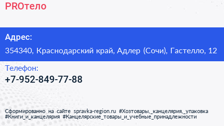 PROтело по адресу 354340, Краснодарский край, Адлер (Сочи), Гастелло, 12 в дальнейшем Организация, размещена в следующих категориях: