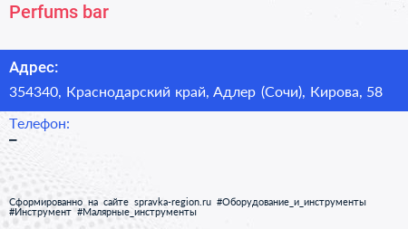 Perfums bar по адресу 354340, Краснодарский край, Адлер (Сочи), Кирова, 58 в дальнейшем Организация, размещена в следующих категориях: