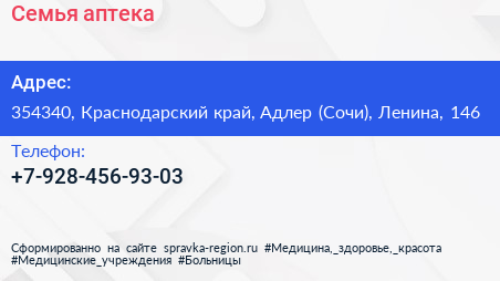 Семья, аптека по адресу 354340, Краснодарский край, Адлер (Сочи), Ленина, 146 в дальнейшем Организация, размещена в следующих категориях: